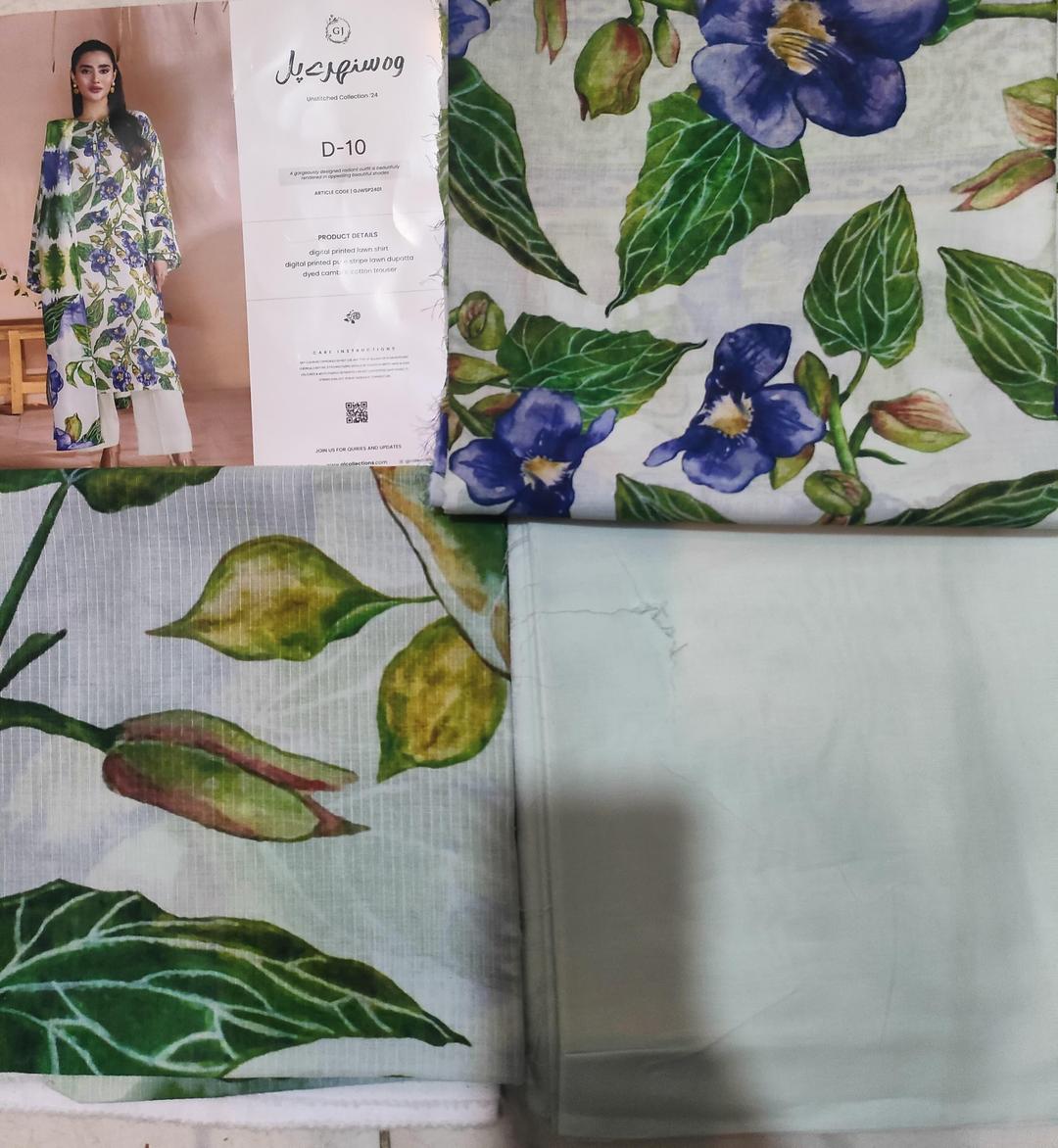 Add a refreshing touch to your wardrobe with this 3-piece unstitched printed lawn suit. Crafted from lightweight and breathable fabric, it features a printed lawn shirt and dupatta paired with a plain cotton trouser for a graceful summer look. Perfect for daily wear or casual outings, this ensemble combines comfort, style, and elegance effortlessly.